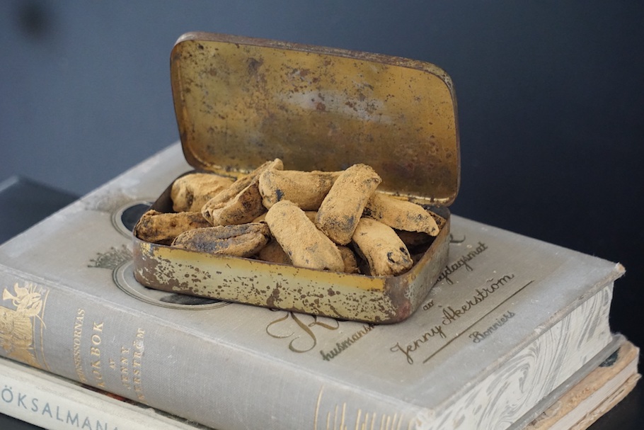 - Rulla runt dadlarna så att lakritspulvret fastnar runt om