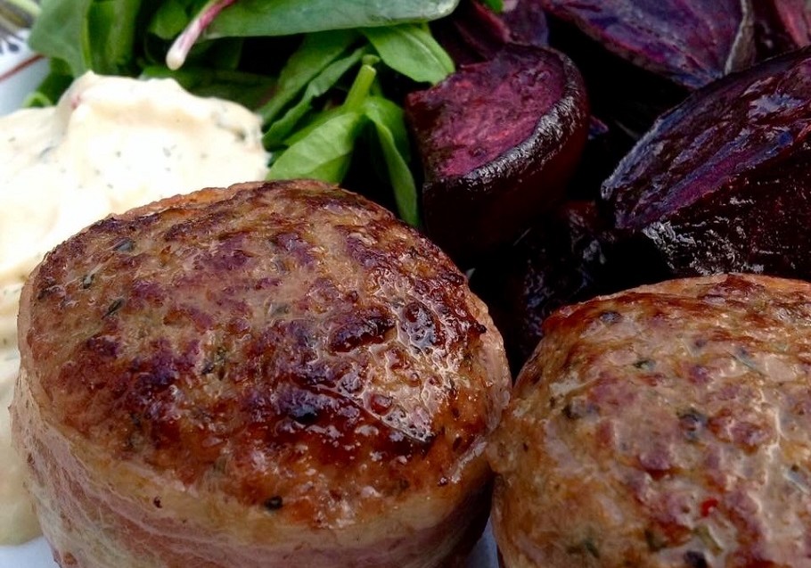Baconlindad Älgfärsbiff Så här gör du Sätt ugnen på 200 grader Lägg färsen i en bunke Skala och finhacka löken och häll ner i…
