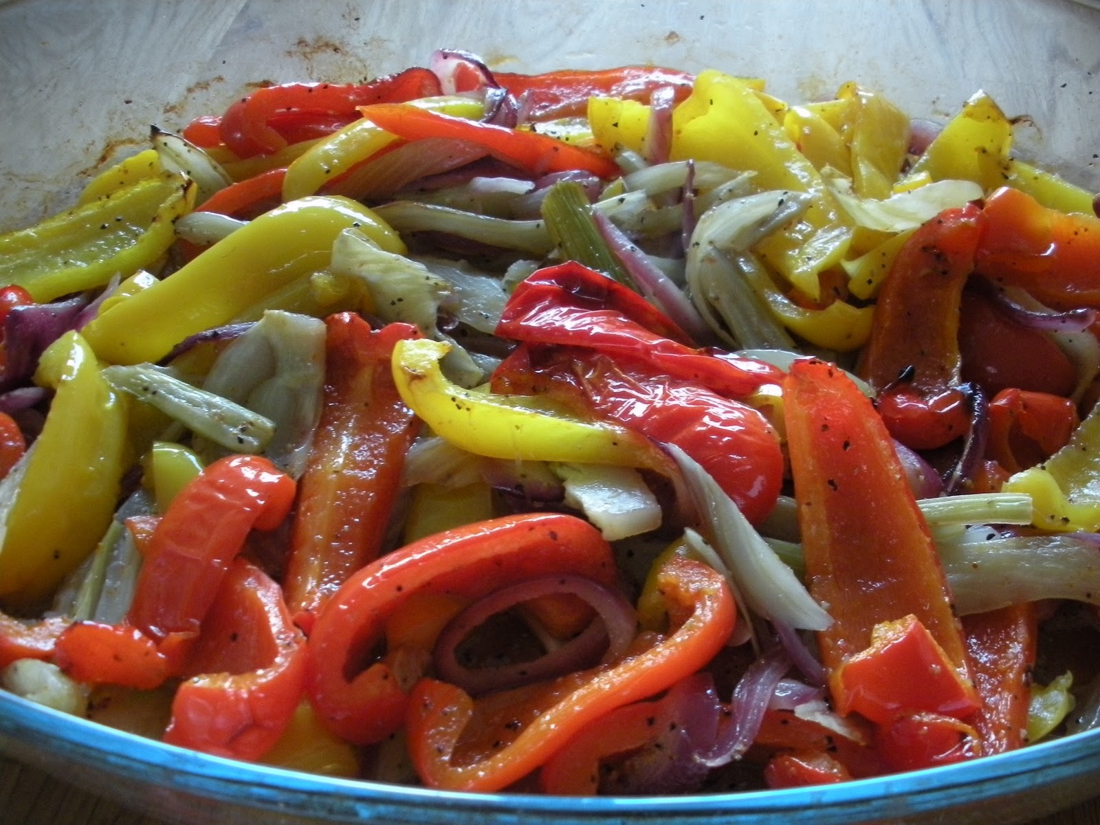 Ugnsgrillad paprika med fänkål och rödlök Så här gör du Sätt ugnen på 225 grader Skölj, kärna ur och dela paprikorna i stora bitar…
