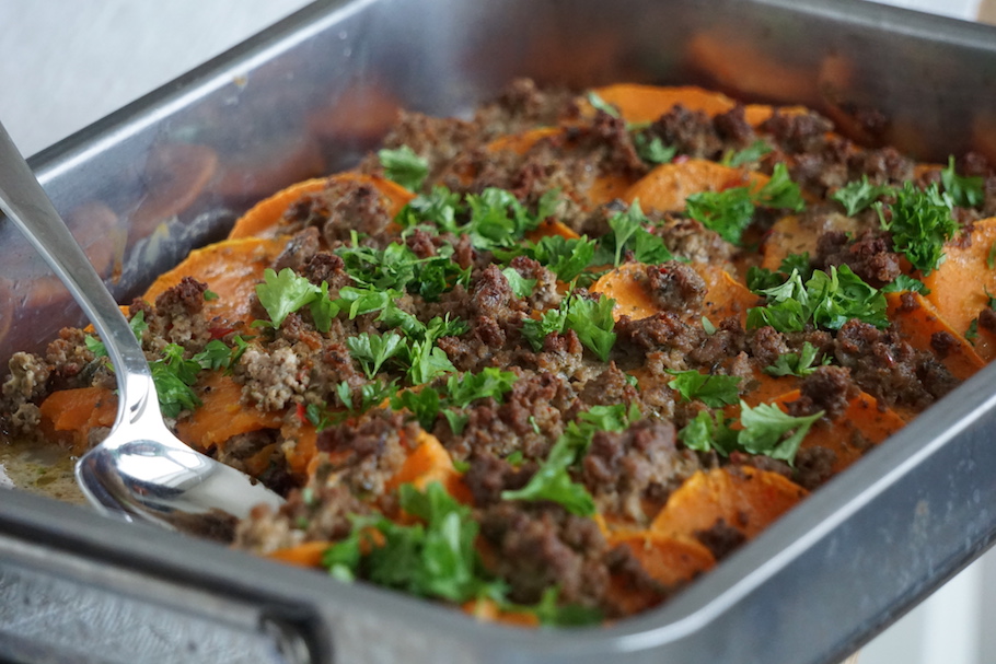 Sötpotatisgratäng med köttfärs Så här gör du Sätt ugnen på 200 grader Skala och skiva sötpotatisen tunt Bryn nötfärsen i en stor gryta eller stekpanna…