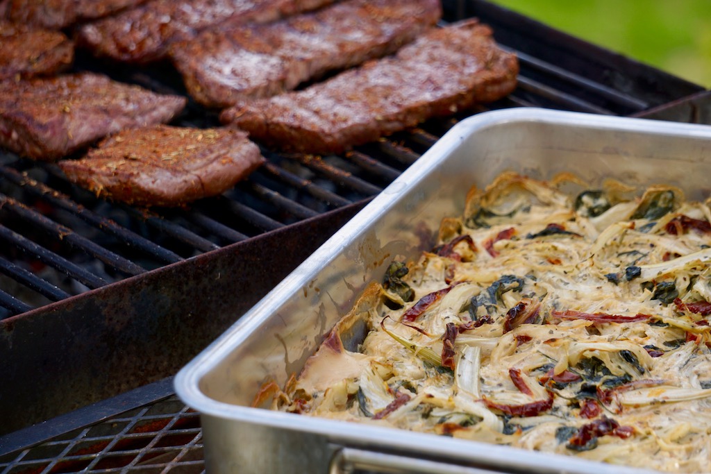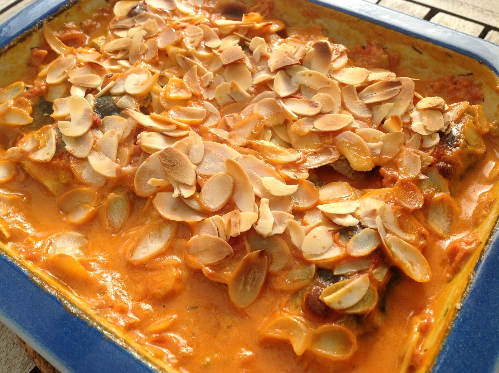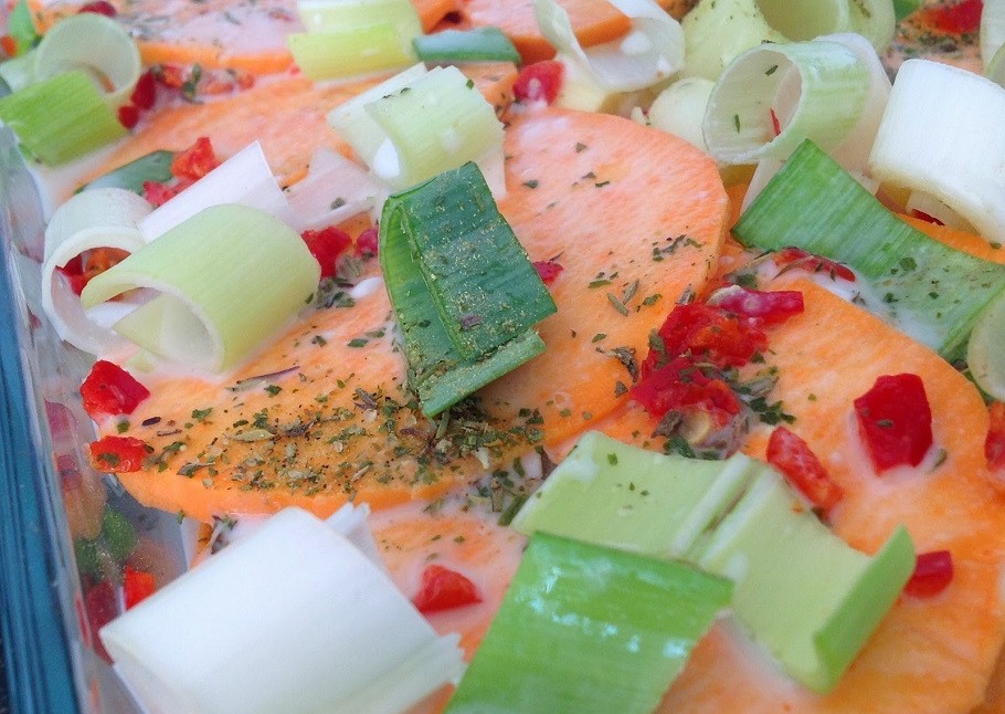 TillbakaSötpotatisgratäng med vitlök, chili och purjolök