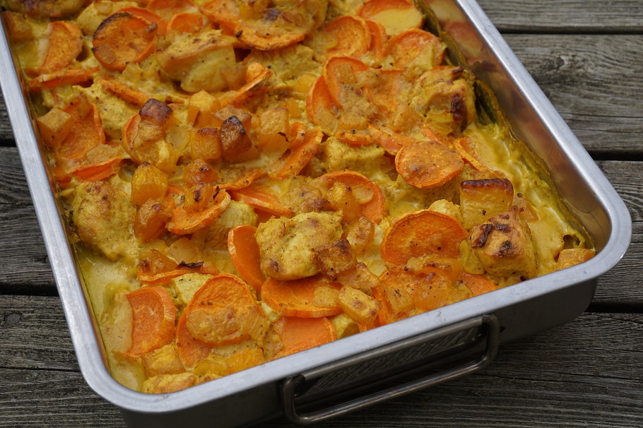 Kyckling och sötpotatisgratäng Så här gör du Sätt ugnen på 200 grader Skala och dela löken i små bitar Klipp ner baconet i en…