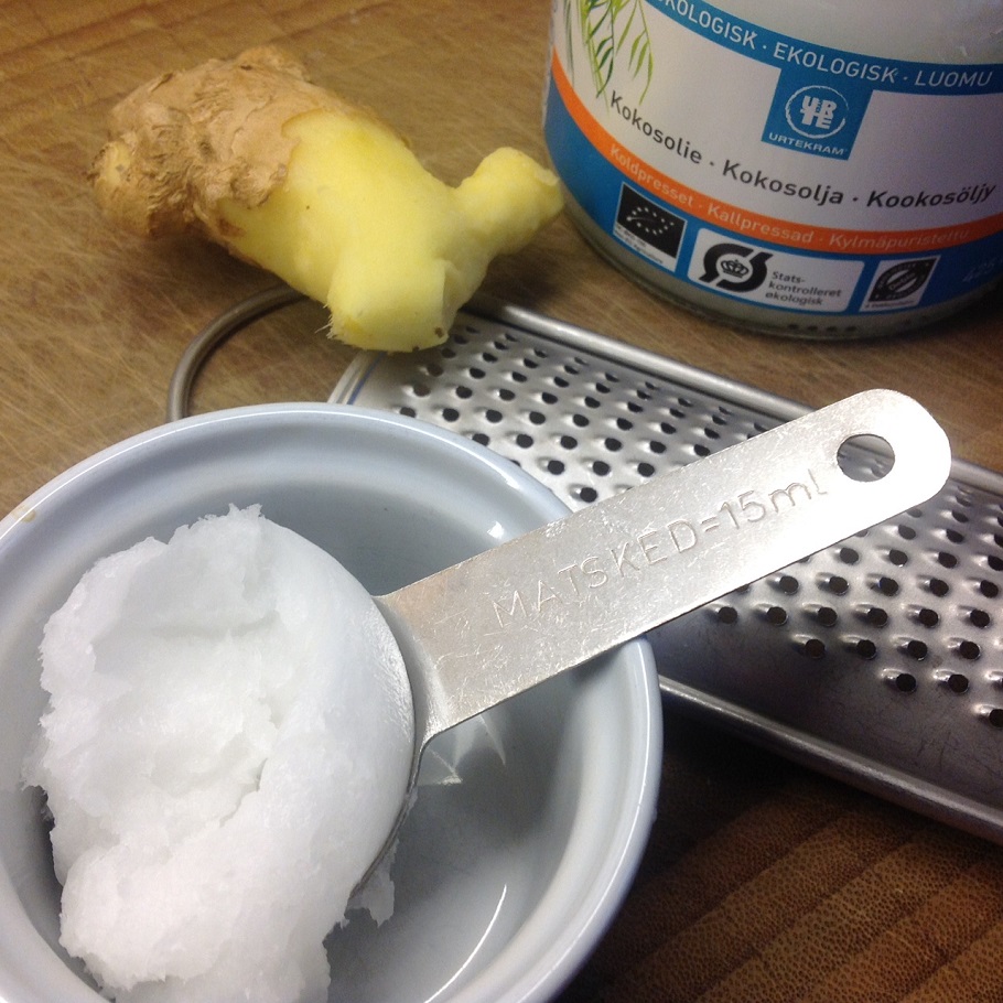 Smaksatt kokosolja Så här gör du Skala och riv ingefära Ta tillvara på den “saftiga fina massan” (inte trådarna/böset) blanda den rivna ingefäran med kokosolja…
