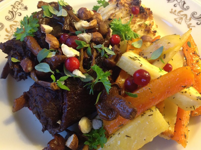 Höstrullader fyllda med trattkantareller, bacon, lök, persilja och lingon