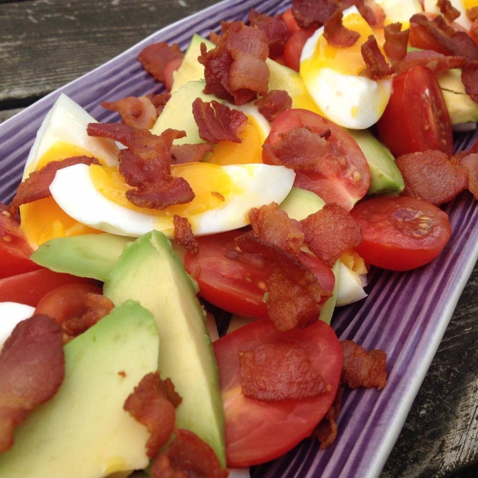 Avokadosallad med ägg, tomat och knaperstekt bacon